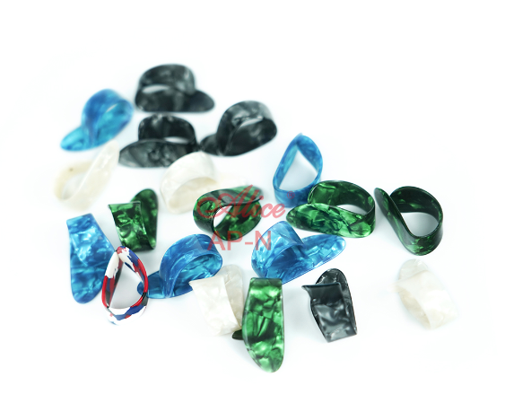 Celluloid thumb picks are cut from celluloid sheets and bent to their special shapes. They are smooth edged, colorful, and durable.